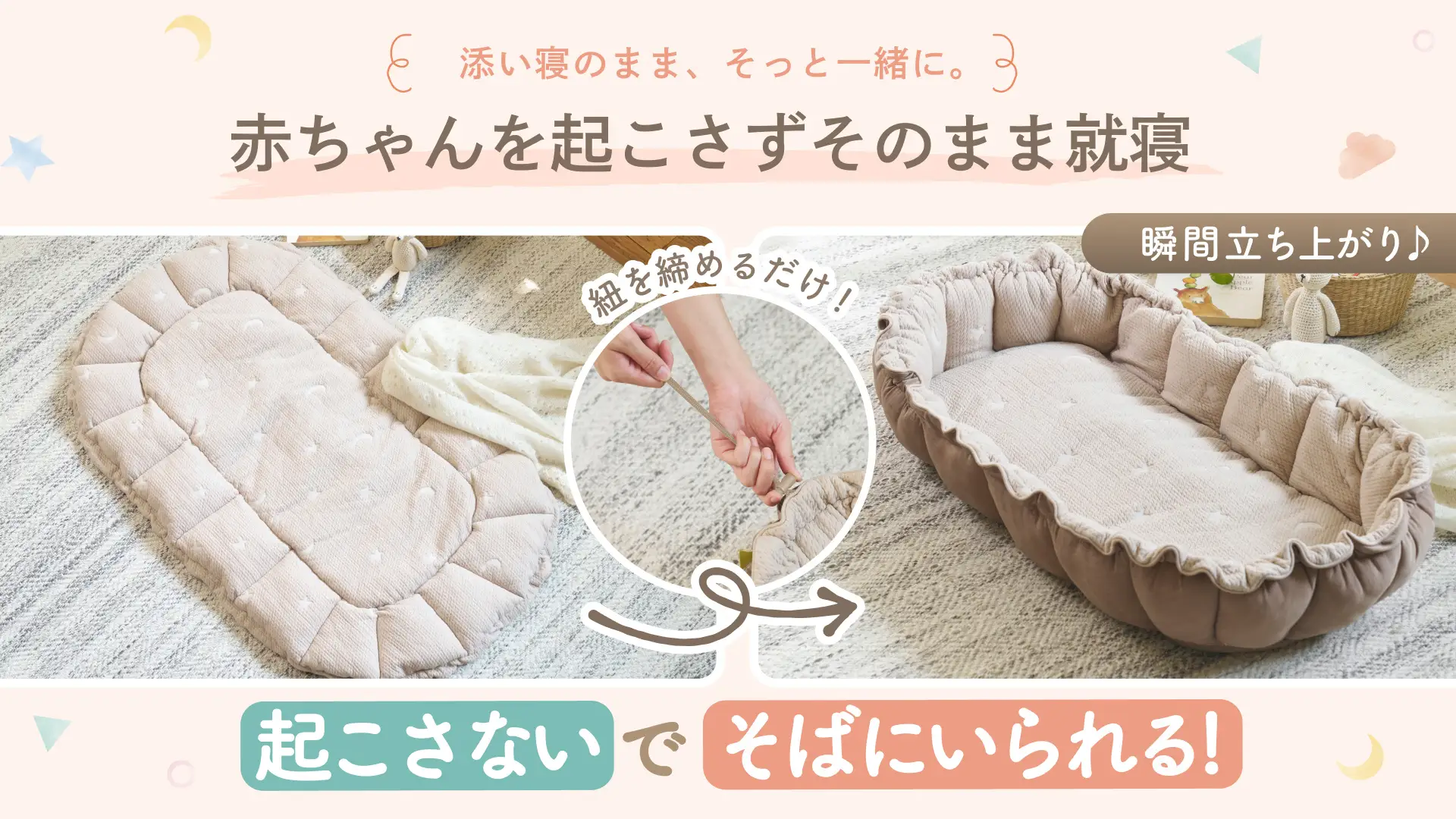 夜泣きや寝かしつけ、添い寝中の不安…多くのママたちが感じる育児の悩みを少しでも減らしたいという想いから、このベッドインベッドは誕生しました。現役ママと助産師が、「赤ちゃんの安心」と「ママの使いやすさ」を考え、実際の育児シーンから生まれた工夫を随所に取り入れています。新生児から3歳ごろまで、赤ちゃんとママの毎日にしっかり寄り添います。