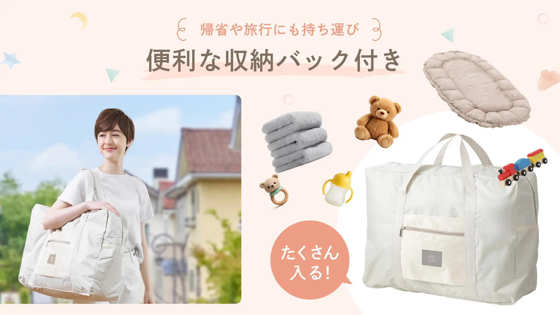 フラットに広げれば、おむつ替えスペースとしても使える仕様です。さらに大容量の収納バッグ付きで、ぬいぐるみやブランケットも一緒に持ち運べます。外出先でもお家でも、赤ちゃんの快適空間をそのままキープできます。