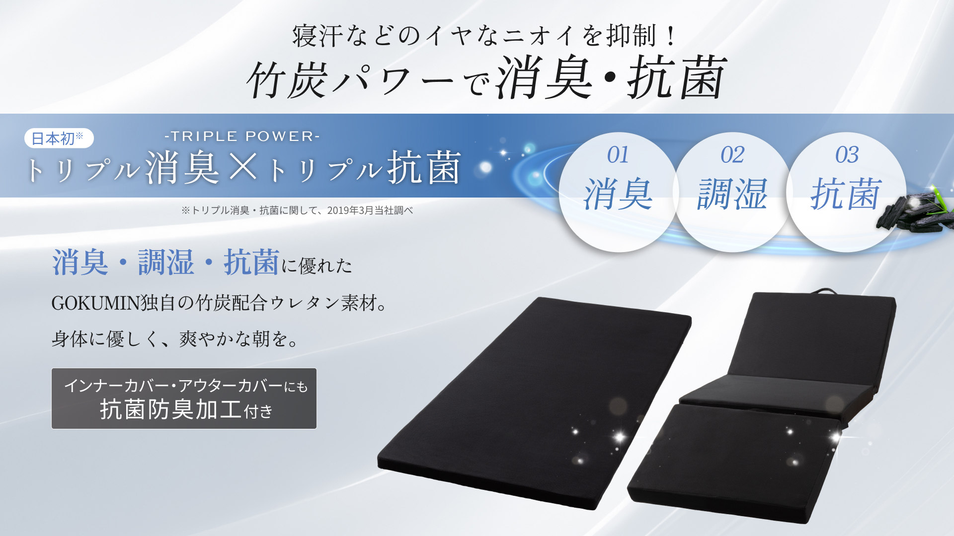 寝汗や湿気、ニオイを抑える「竹炭配合ウレタン」を使用し、消臭・調湿・抗菌のトリプル効果を発揮します。さらに、極厚3Dメッシュカバーが湿気を外へ逃がし、ムレを防止。カバーは着脱して丸洗いできるため、いつでも清潔に保てます。寝汗が気になる方や、年中快適に眠りたい方にも最適な、通気性と清潔さを両立した仕様です。