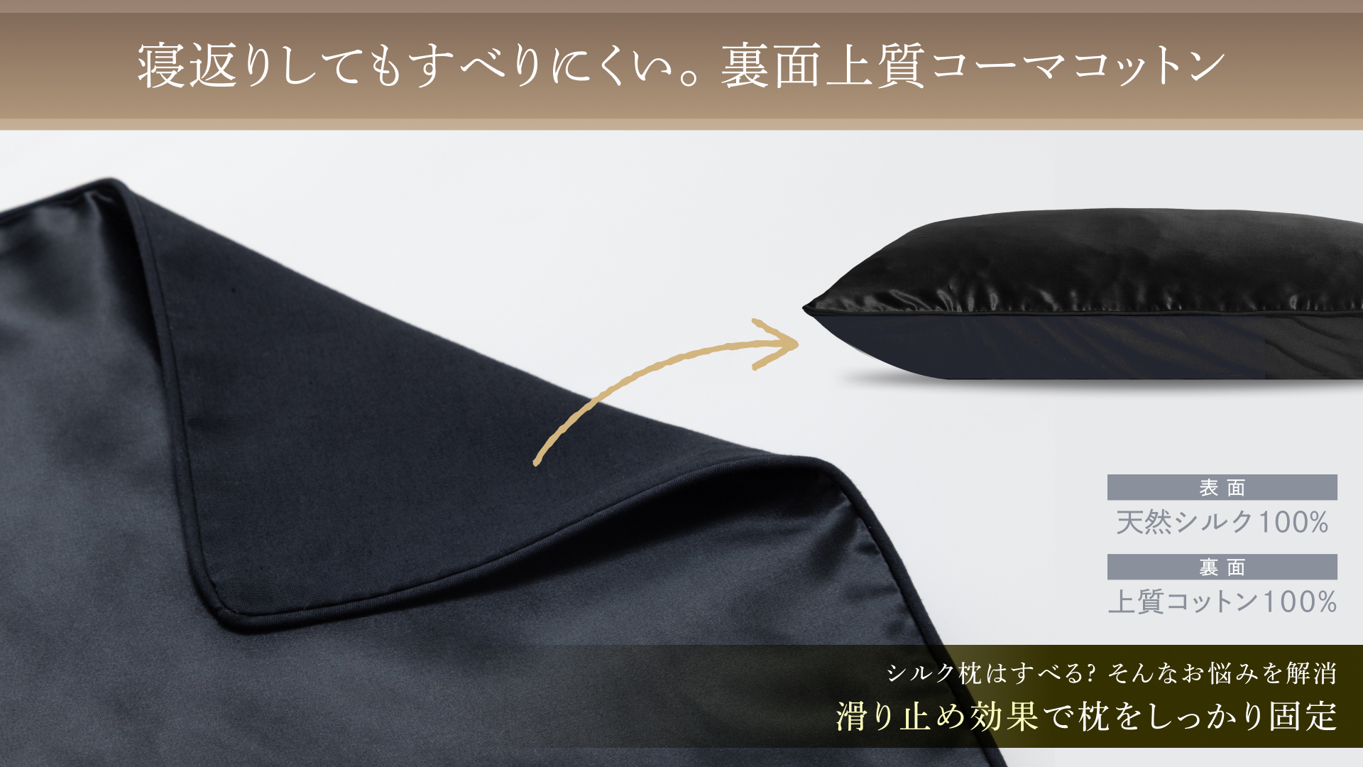 裏面には上質なコーマコットンを採用し、シルク特有のすべりやすさを軽減。枕がずれにくく、寝返りをしても安定した寝姿勢を保ちます。また、やわらかなコットンが通気性を高め、蒸れにくく快適な使い心地を実現。異素材の組み合わせにより、心地よさと扱いやすさを両立した設計です。