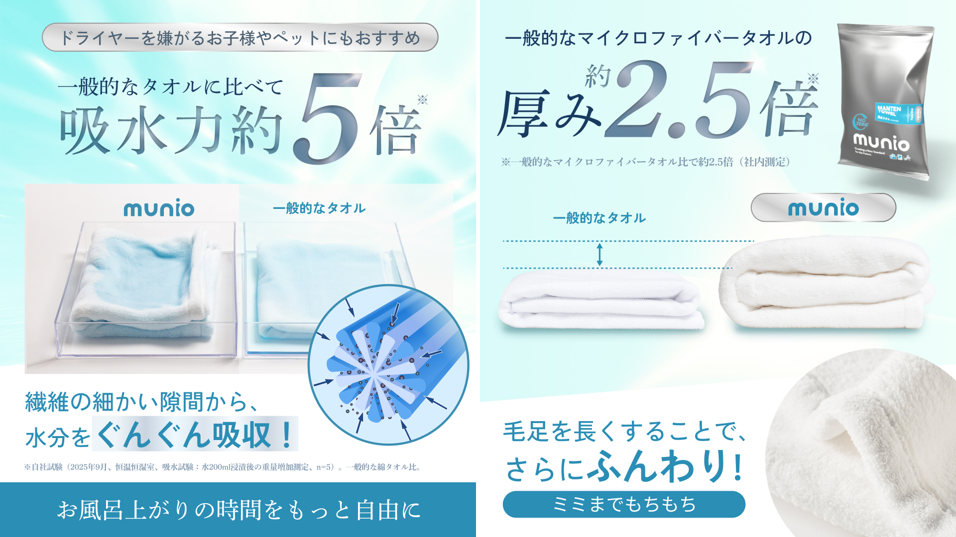 株式会社KURUKURU(本社:東京都中央区銀座、代表取締役:関沢康寛)は、薬剤不使用でニオイ菌を99.9%(*1)抑制する「NioZero®抗菌技術」を搭載した新ブランド「MUNIO(ムニオ)」を立ち上げました。第一弾として「MANTEN TOWEL」、「EINEN TOWEL」、「ONSOKU TOWEL」の3商品を2025年11月5日より販売開始いたします。“清潔”がつづく、タオルの新常識を作っていきます。