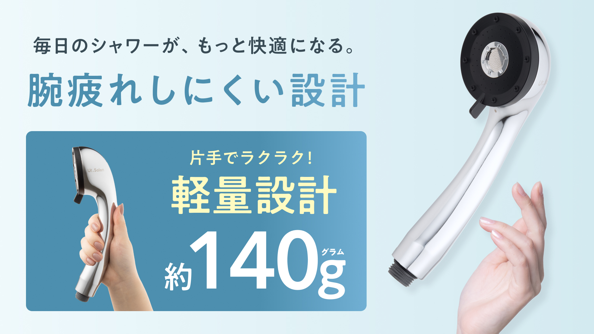 多機能シャワーヘッドは重くなりがちで、使うたびに腕が疲れる、取り回しにくいと感じることも。本製品は高機能設計でありながら約140gの軽量化を実現。長時間使っても扱いやすく、毎日のシャワーでも負担を感じにくい設計です。腕への負担を抑え、快適でストレスの少ないバスタイムを叶えます。