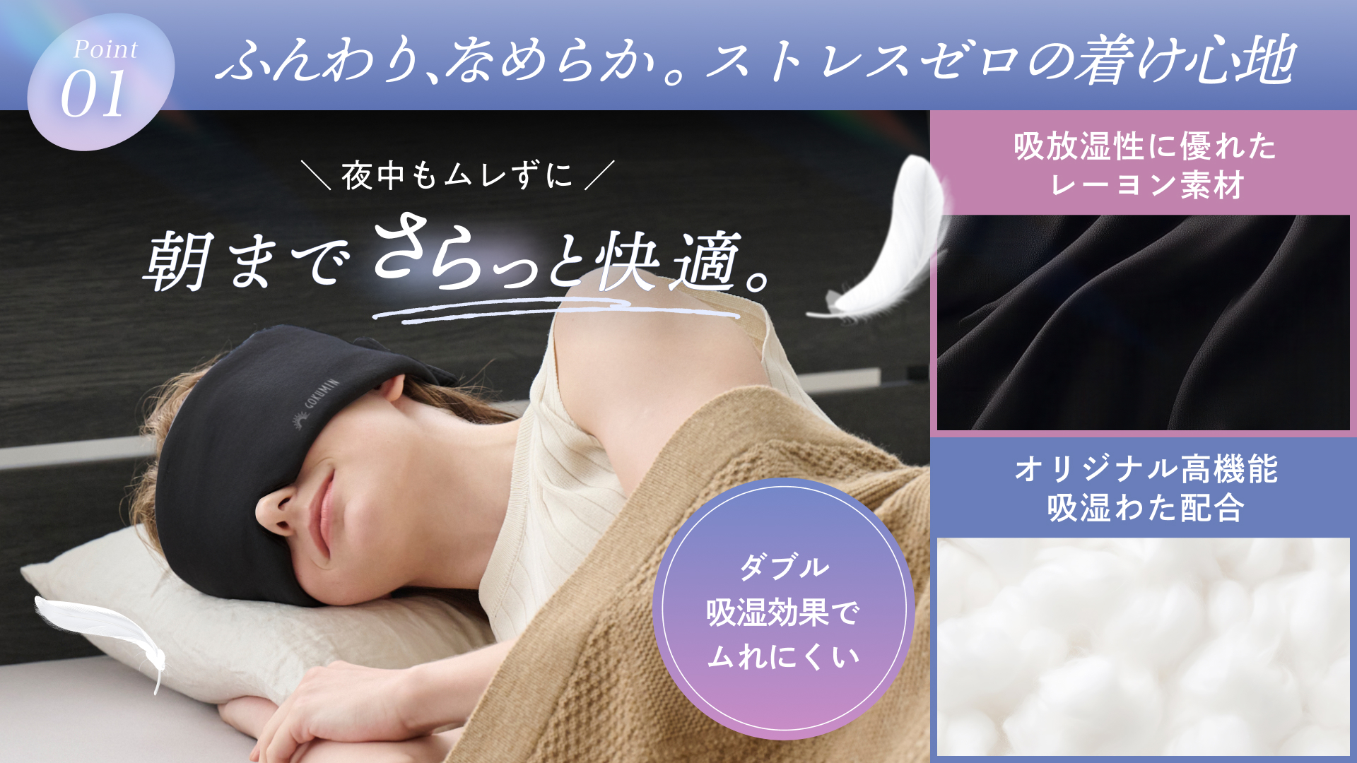 吸放湿性に優れたレーヨン素材とオリジナル高機能わたを組み合わせ、汗や湿気をしっかり吸収・放出。睡眠中の蒸れやベタつきを軽減し、長時間着用してもさらりとした肌ざわりをキープします。夜通し快適な環境を整え、朝まで心地よい眠りをサポートします。