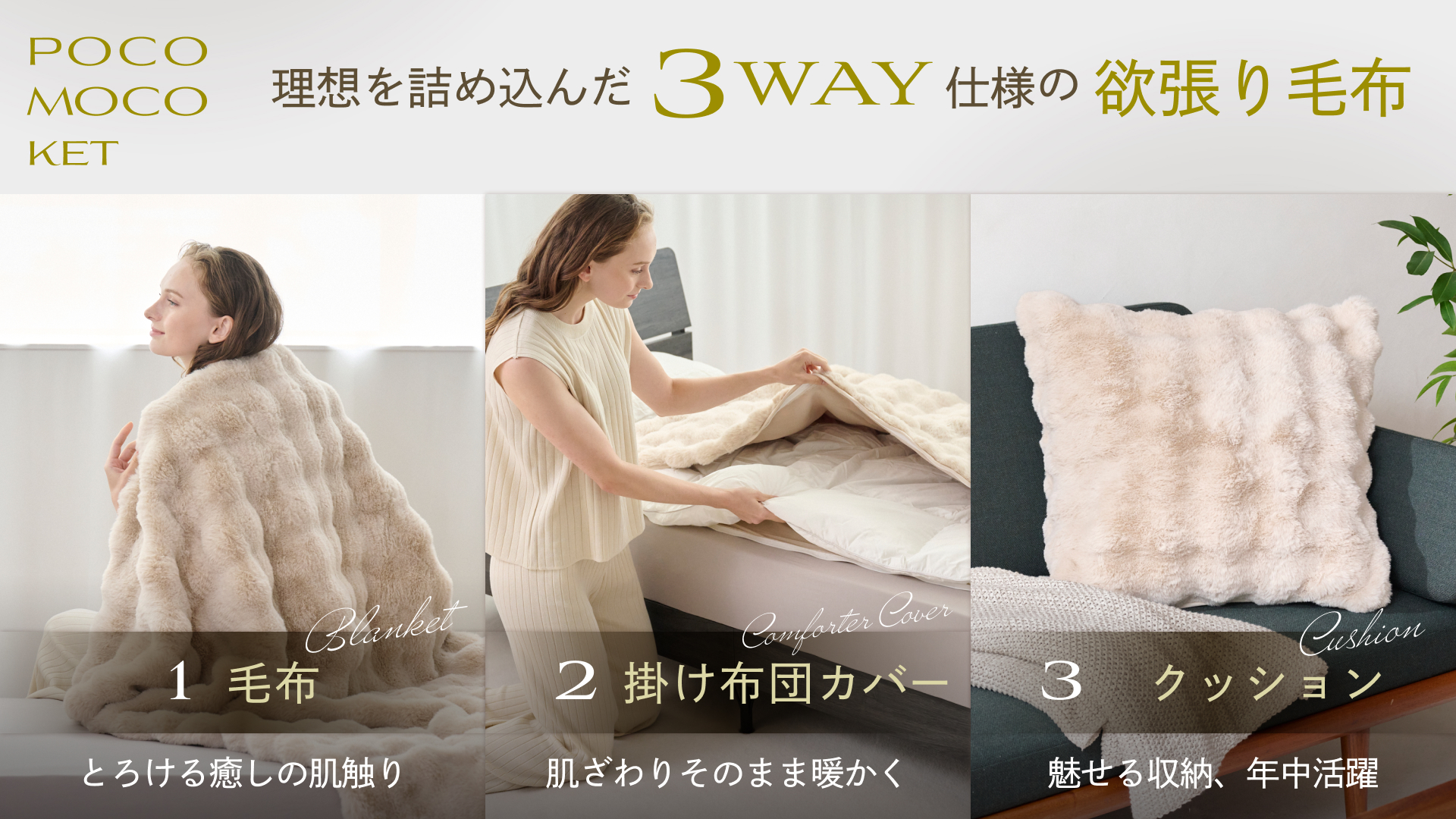 くつろぎの時間を格上げする1枚で毛布・掛け布団カバー・クッションとして使える万能ケットが登場。高密度のふわもこ生地が空気を抱え込み、極上のぬくもりを実現しました。抗菌防臭・静電気防止加工で清潔&快適、おうちで丸洗いも可能です。リバーシブル仕様で気分やシーンに合わせて使い分けでき、見た目もおしゃれ。普段使いから来客用まで、暮らしをワンランクアップさせる「とろけるご褒美ケット」です。