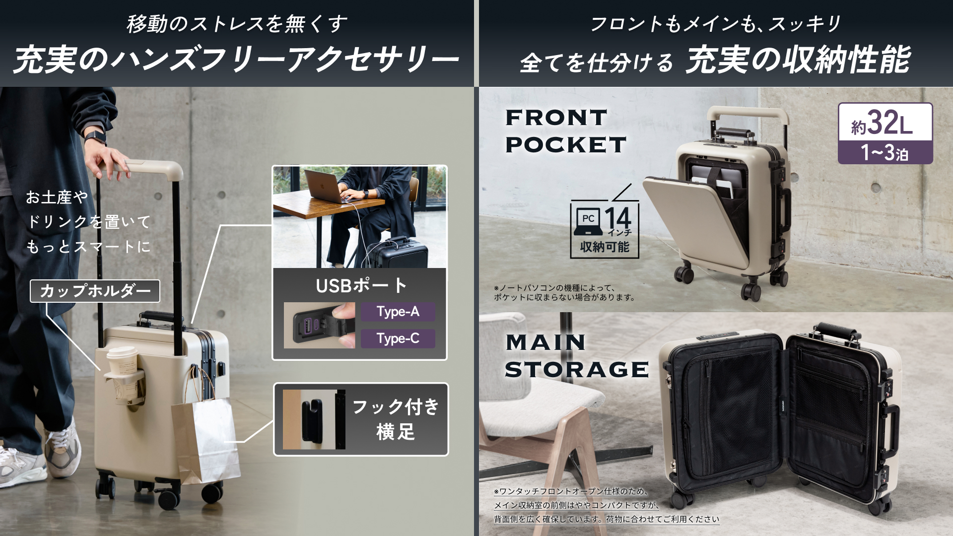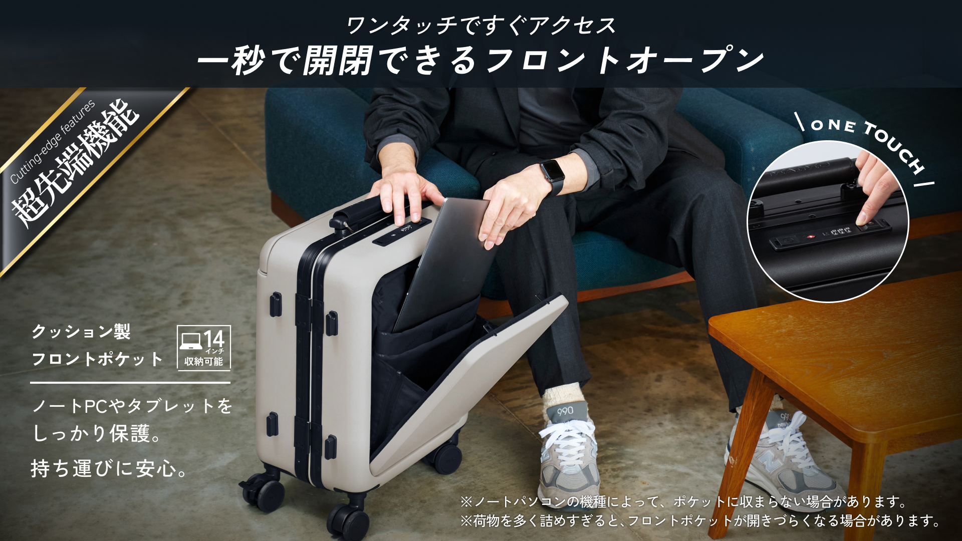 一秒で開閉できる ワンタッチフロントオープン構造を採用。空港や移動中でも荷物を素早く取り出せます。さらにPCやタブレットを守るクッション入りポケットを搭載し、出張やワーケーションにも最適です。