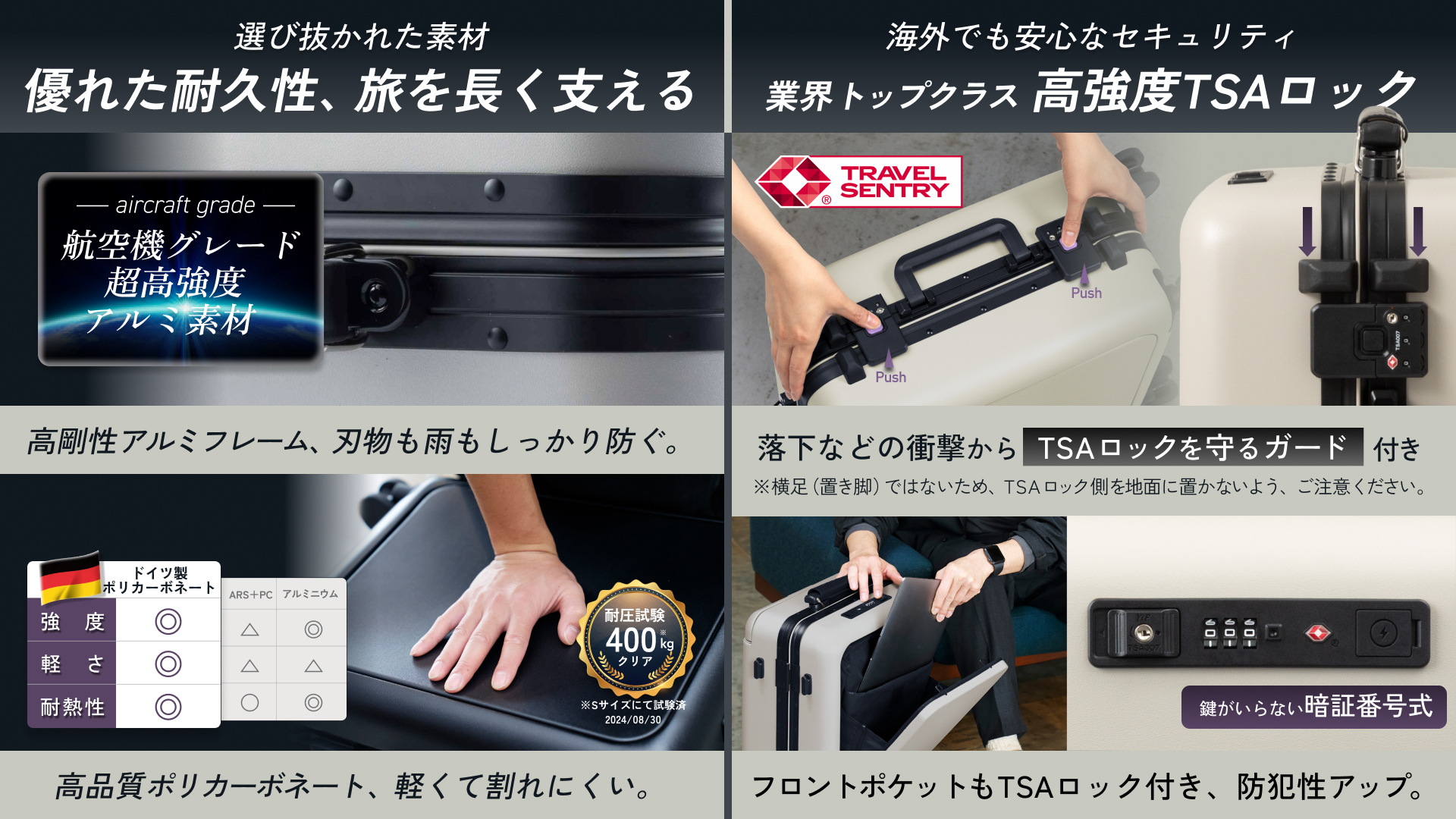 フレームには航空機グレードの超高強度アルミ合金、ボディにはドイツ製ポリカーボネートを採用。衝撃や変形に強く、長期間安心して使える耐久性を実現しました。さらに、フロント収納・メイン収納の両方に世界基準のTSAロック を搭載し、海外旅行でも安心。鍵を持ち歩く必要がないため、紛失リスクが軽減します。