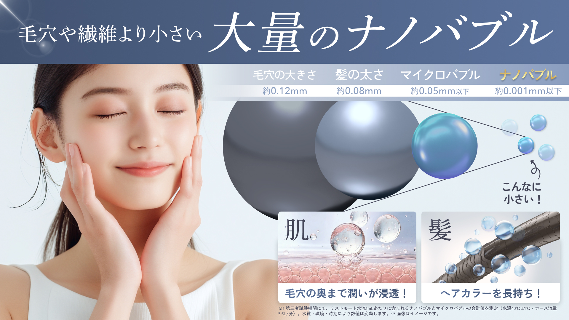 紫外線や冷房で乾燥しがちな髪や肌を、毛穴より小さなナノバブルがやさしく洗浄し、うるおいと温もりを届けてくれます。しっとり艶やかな美しさを取り戻し、浴びるたびに美容液に包まれるような美肌シャワー体験を提供します。さらに、男性が抱えがちな髪のボリューム、頭皮のかゆみ・べたつきなどのトラブルも、ナノバブルが毛穴の奥まで浸透することでケアすることができます。