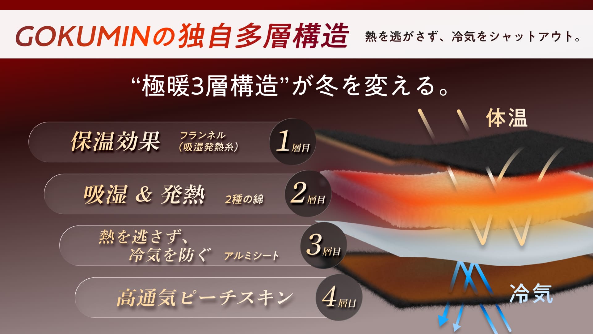 GOKUMIN独自の「極暖4層構造」が熱を逃さず冷気をブロックします。吸湿発熱繊維「PRIME WARM®」が体から出る水分を吸収して熱に変え、断熱アルミ層がそのぬくもりを閉じ込めます。布団に入った瞬間から背中までじんわり温まり、寒い冬でも電気に頼らず自然なあたたかさで快眠へ導きます。